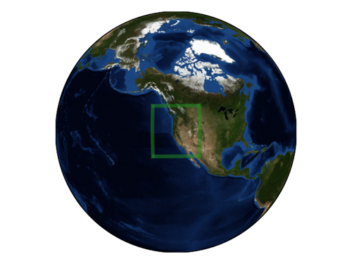 The first is labelled PNW for Pacific North West, is an unusual region as it is smaller than our other regions and has a resolution of 25 km. The model region encompasses the Eastern Pacific Ocean and the Western US, extending inland as far as the Rocky Mountains. North to south it stretches from Canada down to the Gulf of California, and includes the Coast Range of mountains.