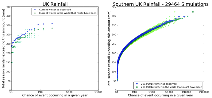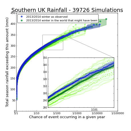 When you look at the return time plot for any of our climate attribution studies, such as the Weather@Home 2014 UK Flooding experiment, the results are presented as a return time plot with two curves – blue and green, plus some light green dots: